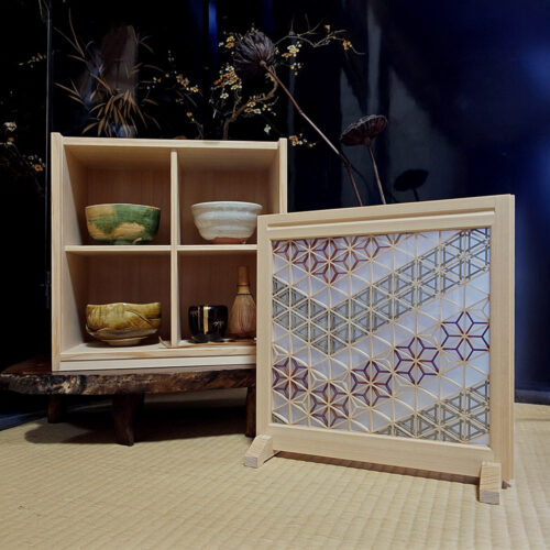 This shelf has fixed dividers and can display four Matcha bowls. There are two types of Kumiko lattice designs available for the doors.